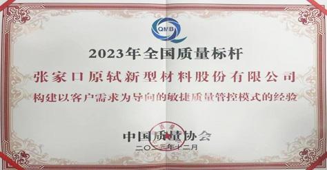 2023-12-072023年12月,張家口原軾新型材料股份有限公司憑借 “構建以客戶需求為導向的敏捷質量管控模式的經驗”,榮獲2023年全國質量標桿企業。